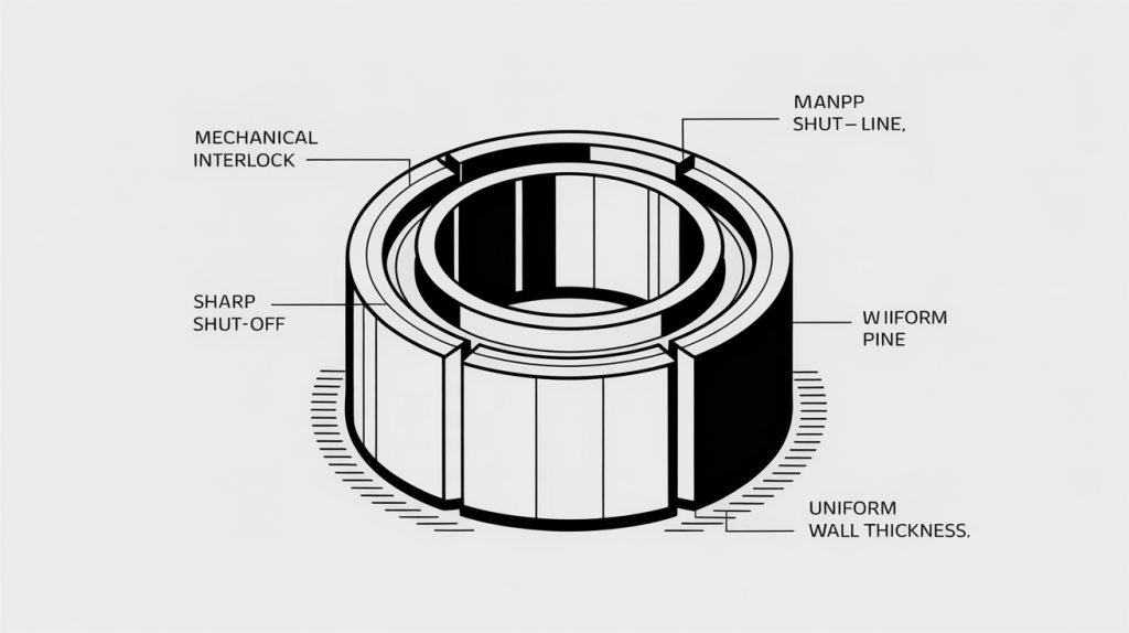 - Mechanical Bond: When materials are not chemically compatible, a strong connection can be achieved through clever part design. The substrate is designed with features like holes, grooves, or undercuts that the overmold material flows into, creating a physical interlock that holds the two parts together.