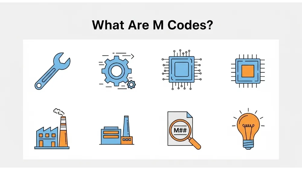 M codes are miscellaneous commands that manage auxiliary functions and machine operations. Unlike G codes, which control motion, M codes handle tasks like starting or stopping the spindle, turning on coolant, or ending a program.