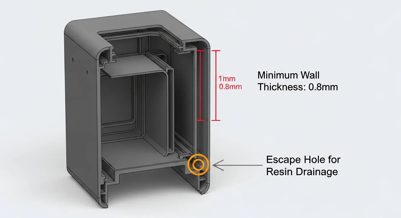 Resin is naturally more brittle than thermoplastic filaments like ABS. To ensure structural integrity, we recommend a minimum wall thickness of 0.8mm for most functional parts, although non-structural micro-features can be rendered down to 0.3mm. Thin walls that are too tall may warp during the UV curing process, so we often suggest adding internal ribs or gussets to provide rigidity without significantly increasing the part's volume or cost.