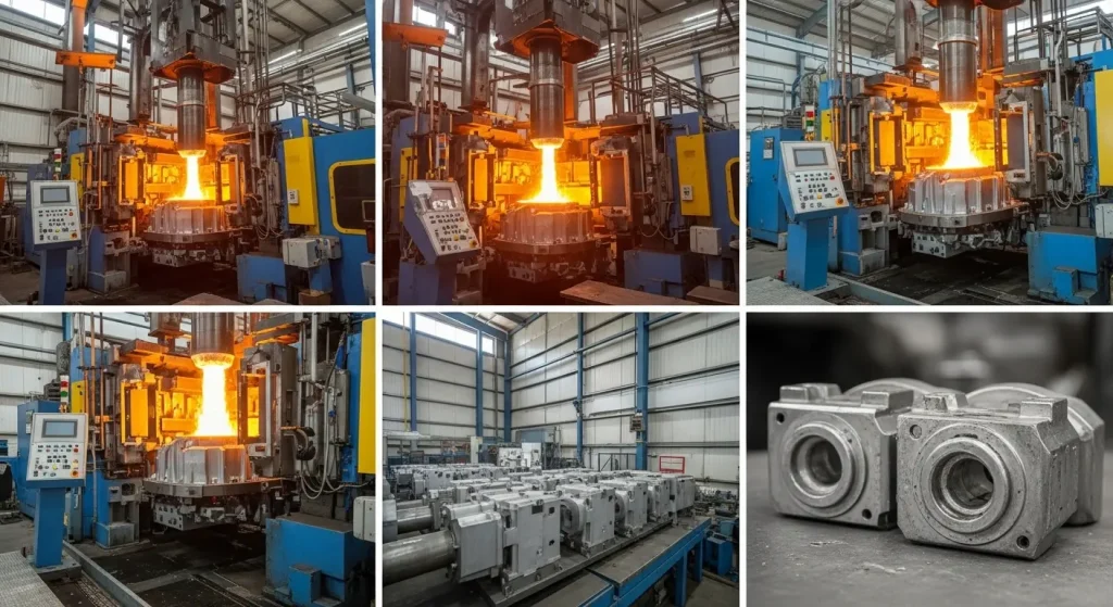 The first stage is heating the die to a controlled temperature to prevent premature solidification. The high-pressure plunger system injects molten metal into the cavity. Once filled, the metal solidifies within seconds, and the mold opens to expel the finished part.