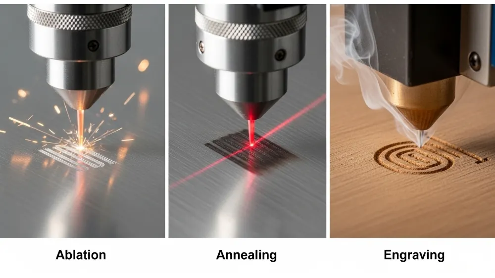 Laser annealing uses heat to change the surface color of metals without physically altering the topography. This technique is common for stainless steel and titanium, producing abrasion‑resistant marks that do not penetrate the material.