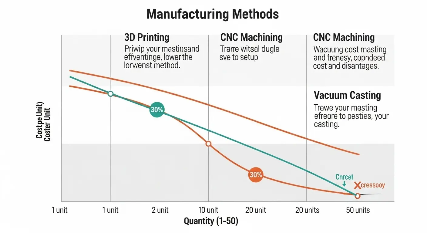 For a single piece, 3D printing almost always wins on price because it has virtually zero setup cost. However, as you move toward 50 pieces, the labor of post-processing each 3D print starts to add up. In contrast, vacuum casting has a higher initial setup (the silicone mold) but a much lower unit price. By the 25th piece, the total cost of vacuum casting often crosses below the cost of 3D printing.